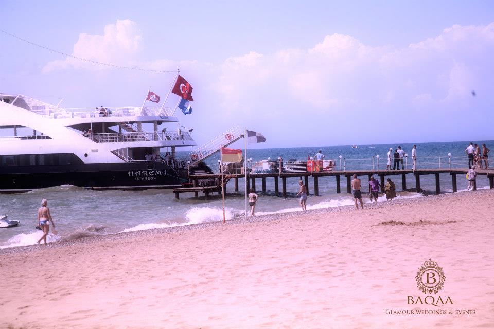 Sana & Sultan’s big fat Indian and Saudi destination wedding in Kempinski Belek, Antalya, Turkey by BAQAA in 2012. Turnkey services with Save the date, Wedding website, Invitation cards, Invitation boxes, Wedding stationary, Room hampers, Wedding gifts , Visuals, Design, Concept, Setup, Lighting, Decor, Entertainment, logistics created by BAQAA. Their beautiful journey started with a Welcome Dinner on Harem. The biggest yacht for 400 guests in Antalya. Guest welcome by a traditional Turkish musical trio. Turkish delights, hospitality desk, a unique yacht party with freshly made Turkish cuisine for 400 guests on a luxury yacht, band and performances from Germany, Ottoman band and parade, Turkish ice cream showman, floating lanterns followed by a crazy after party.